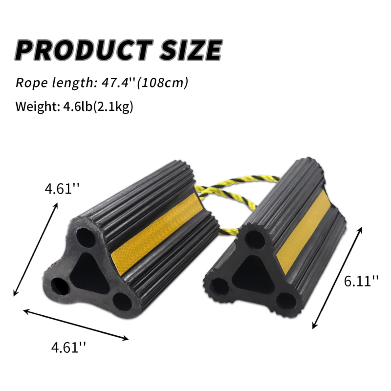 ⭐Perfect large heavy-duty wheel chocks for cars! Our wheel chocks are made of high-quality rubber and have substantial weight (6.6lbs total), enough to stay put the car while not being too heavy to move around. Size is 4.2" ×4.7" ×8.2" and perfect for most wheels/tires and utility trailers. Travel trailer accessories like these are essential for a secure parking experience.
